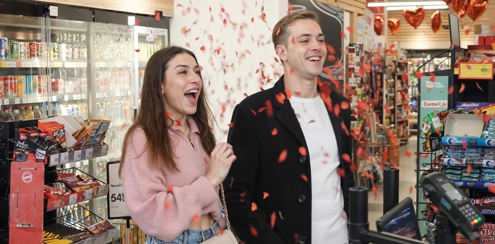 Za odabrani, dorćolski DTL PerSu market smo za Dan zaljubljenih osmislili iznenađenje za parove koji su se zatekli na licu mesta, tačnije kasi. Prodavci i prodavačice opremljeni konfetama u obliku srca su pažljivo čekali i birali da iznenade parove koje viđaju svakodnevno. Svaki par koji bi prišao kasi ovih dana odmah bi bio „obasut ljubavlju“ i bukvalno.
